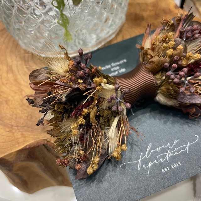 落ち着いたブラウンミックス ふわふわや つぶつぶの実 煉瓦色の葉 同じトーンでも質感を様々にして楽しく クリップタイプなので装着は簡単 裏面はシャツなどに色移りをしないように お花はつけておりません ジャケットなしのシャツだけスタイルでも ボウタイをアクセントに weddingのほか、 イベントやおめかしの日に、ご活用いただいております size. 約10㎝ タイベルトをご希望の方は、オーダーメイドのflower bowtieにて対応させていただきます プリザーブドフラワーについて プリザーブドフラワーとは生花を加工し半永久的に保存できるようにしたものです 多湿、直射日光を避け保存してください 繊細なものですので、衝撃を与えると花びらがとれたり欠けたりします 梅雨の時期など多湿により花びらの透けや、色移りの可能性が考えられます(透けは湿度が改善されると元に戻ります) 加工されているとはいえ、植物です 繊細な植物と上手にお付き合いいただければと思います お取り扱いの際はご注意ください 以上の点のご承知いただいた上でご購入をお願い致します